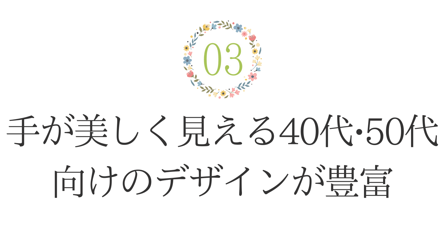 そこで当サロンでは、主に40代・50代の手を美しく見せるのに特化したデザインを多数ご用意しています。